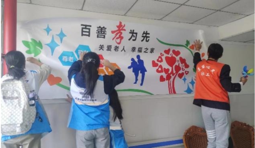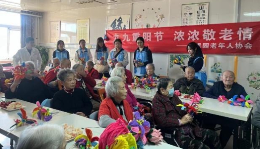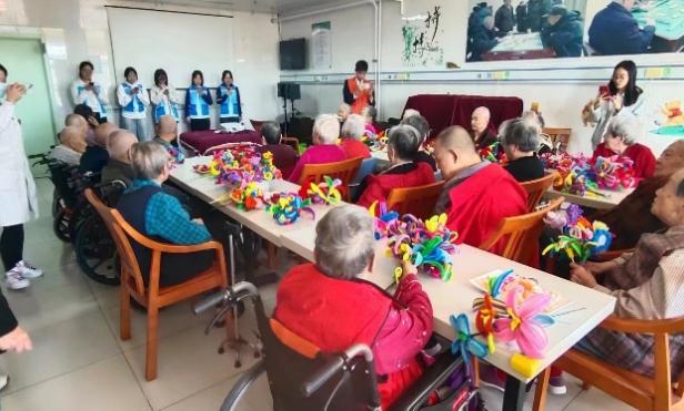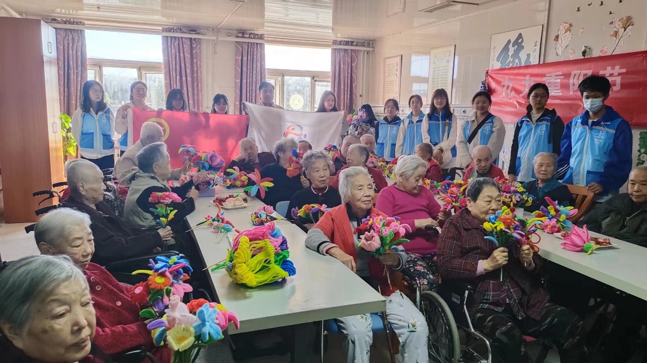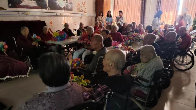 活动伊始,志愿者将准备好的扭扭棒花一束一束送到老人手中,向老人献上诚挚的节日祝福,温馨的问候带动活跃的现场氛围。随后,志愿者和老人围坐在桌旁,共同观看爱国主义红**《我和我的祖国》,通过回顾国家发展中的重大历程,唤醒老人内心深处沉睡的青春记忆。观影结束后,志愿者和老人怀着澎湃的心情,以对唱形式唱起经典军旅歌曲《团结就是力量》。情到至处,爷爷奶奶们纷纷开始个人表演,以歌声迎接重阳节的到来,分享节日来临的喜悦。活动尾声,志愿者协助老人张贴关于“孝”的宣传海报,为养老院营造出浓郁的节日氛围,注入更多的蓬勃生机。秋光苒苒,好景橙黄,但愿人长久,岁岁话重阳。在一片欢声笑语中,活动落下帷幕。