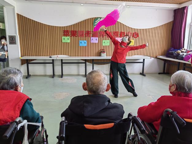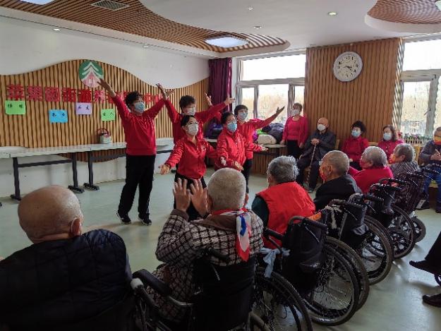 活动伊始,舞蹈队的阿姨们手持精美的真丝舞扇,献上精彩绝伦的中国舞表演,志愿者也用新学的曲裾舞为节日助兴。她们用翩翩舞姿赢得在场所有人的掌声,借助传统艺术的魅力让老人们感受到来自社会的关爱和温暖。紧接着,舞蹈队与志愿者一齐演唱《我和我的祖国》、《团结就是力量》等红歌。家喻户晓的旋律唤起深厚的爱国情怀,老人们不禁跟着节奏哼唱起来。情到至处,有几位老人高声清唱自己喜爱的红色歌曲,昂扬的曲调和沧桑而不失力量的歌喉博得一片叫好,现场气氛欢快而热烈。
