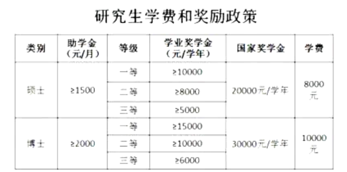 硕士基本助学金不低于1500元/月(覆盖面100%),学业奖学金不低于10000、8000、5000元/学年,国家奖学金(每生每年20000元,覆盖面由国家制定)、其他岗位助学金、奖金不含在内。