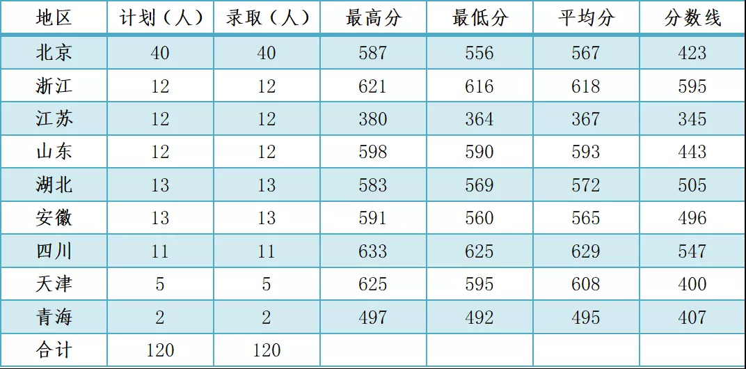 护理本科班(4年制)录取情况:2019年护理学专业本科班计划招生120名,实际录取学生120名,计划完成100%。分布在北京、浙江、江苏、四川、山东、天津、安徽、湖北、青海9个省市。