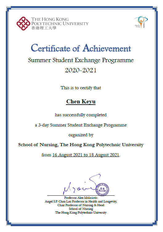 学生通过在线视频授课的方式,锻炼了英文口语交流能力,学习国内外先进护理学科发展经验,开拓了国际视野,对本次国际交流活动给予了极高的好评。同时,与会同学参与课程后收到了由香港理工大学开云(中国)颁发的参与证书。