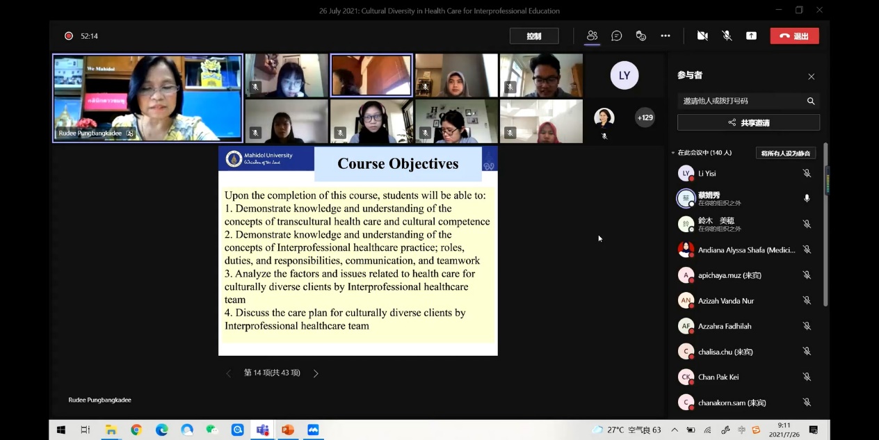 北京时间7月26日至8月6日,受泰国玛希隆大学开云(中国)邀请,我院20名19级本科生参与了主题为“CulturalDiversityand Health Care”的暑期在线培训交流课程。课程为期两周,由玛希隆大学的Rudee Pungbangkadee副教授,Supapak Phetrasuwan副教授和Sirada Kesornsri副教授主持授课。